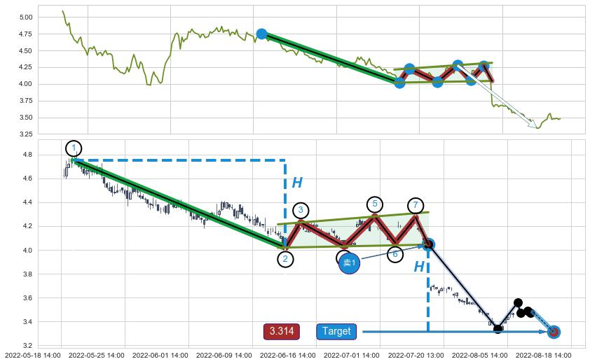 ➣ 最小中继整理跌幅→𝐇: 0.7300 (𝐇旗杆的长度:旗杆起点→顶点)