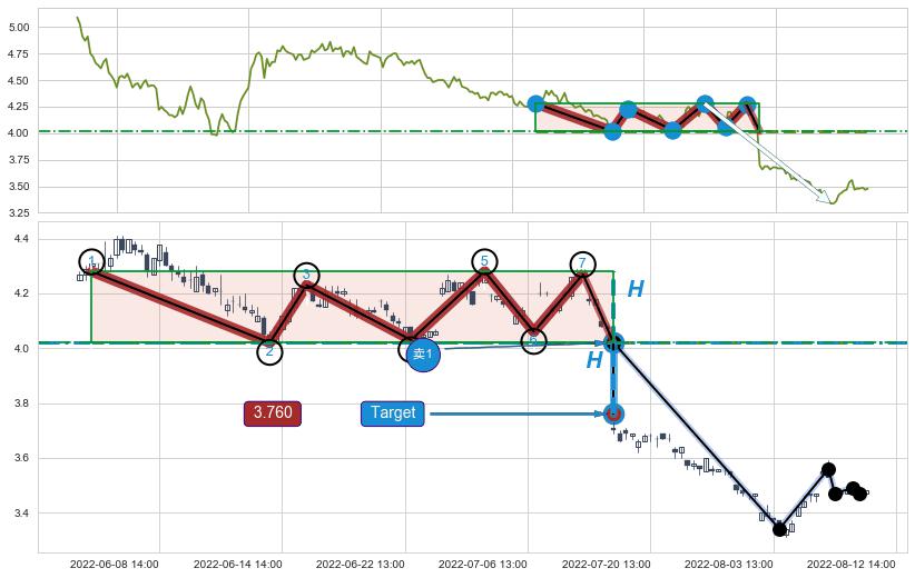从2022-06-14 11:00至2022-08-12 14:00,共包含98个小时,阶段股价下跌-13.39%,阶段股价变动位移路程比: 1 : 6,2022-07-15 13:00向↘︎形成缺口,跳空下跌-9.09%˚