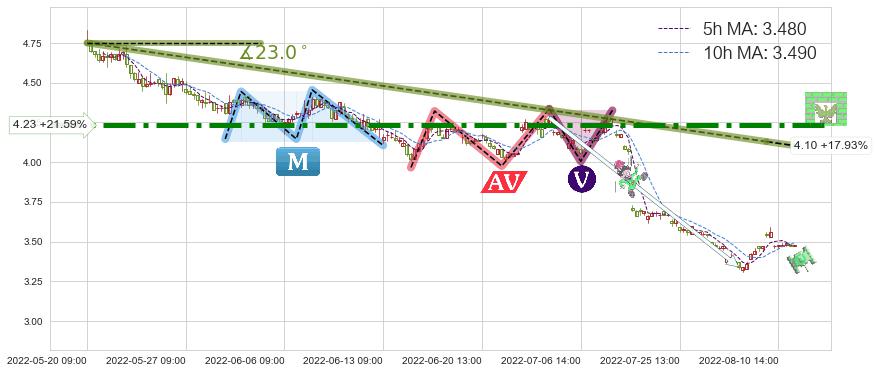 2022-07-12: 第一阻力位4.23强力阻拦了上升趋势,成功阻止了价格的继续上涨。