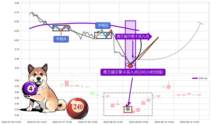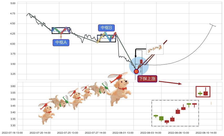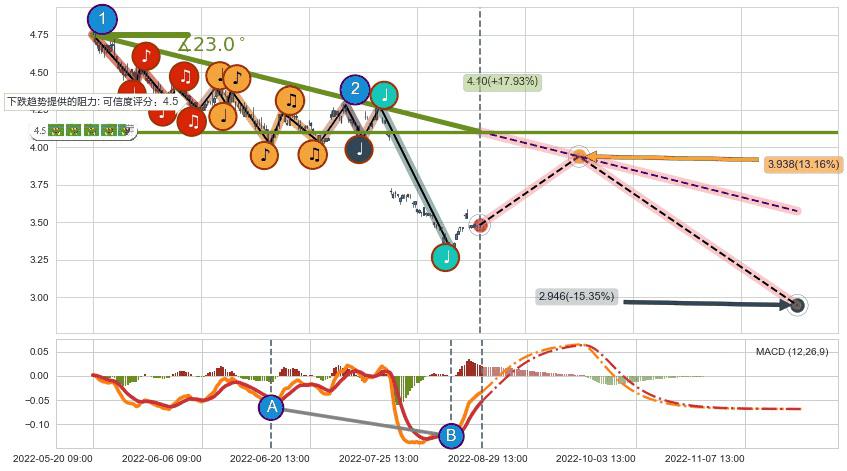 ♘ 在最后的下跌阶段2022-05-20 09:00至2022-08-09 13:00,存在 持续未破位的阻力位 ,阻力价格4.10,可信任强度87.37%,其距离最后价格3.480相差 +17.93%