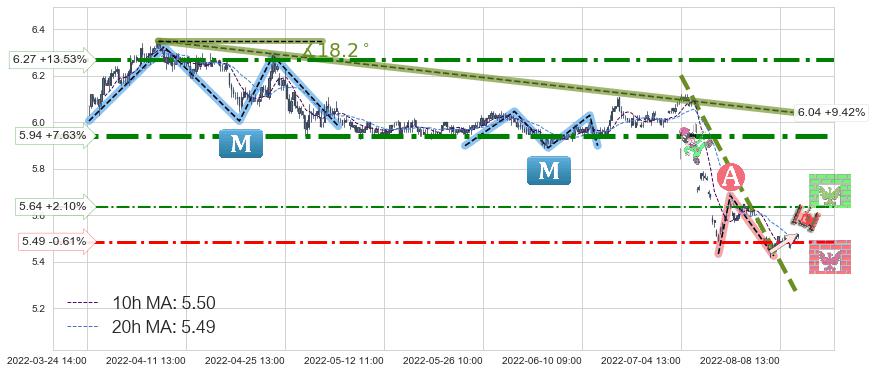 ♘ 阻力价格位5.64,可信任强度38.42%,距离最后交易2022-08-12 14:00形成的收盘价格5.52相差 +2.10%