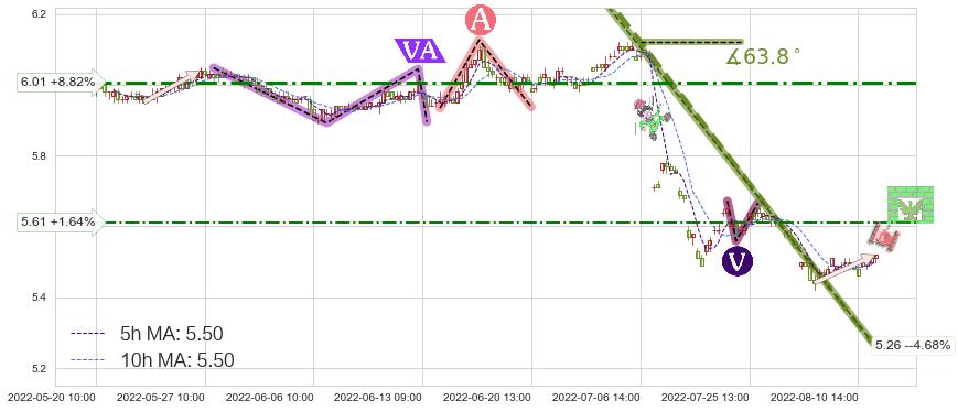 ♘ 阻力价格位5.61,可信任强度41.61%,距离最后交易2022-08-12 14:00形成的收盘价格5.52相差 +1.64%