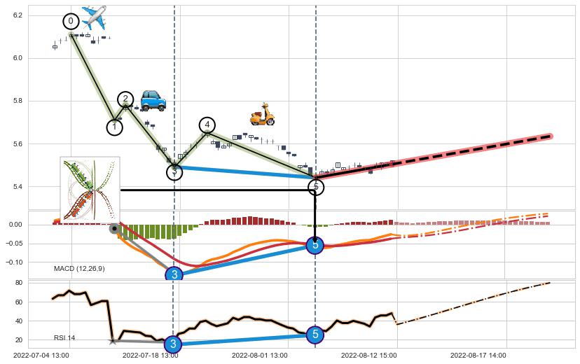 ➣ 第一, 三, 五浪下跌动能逐渐【衰弱变小】,趋势呈现不稳迹象