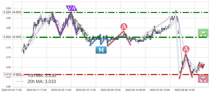 ♘ 阻力价格位3.202,可信任强度90.09%,距离最后交易2022-08-12 14:00形成的收盘价格3.040相差 +5.33%