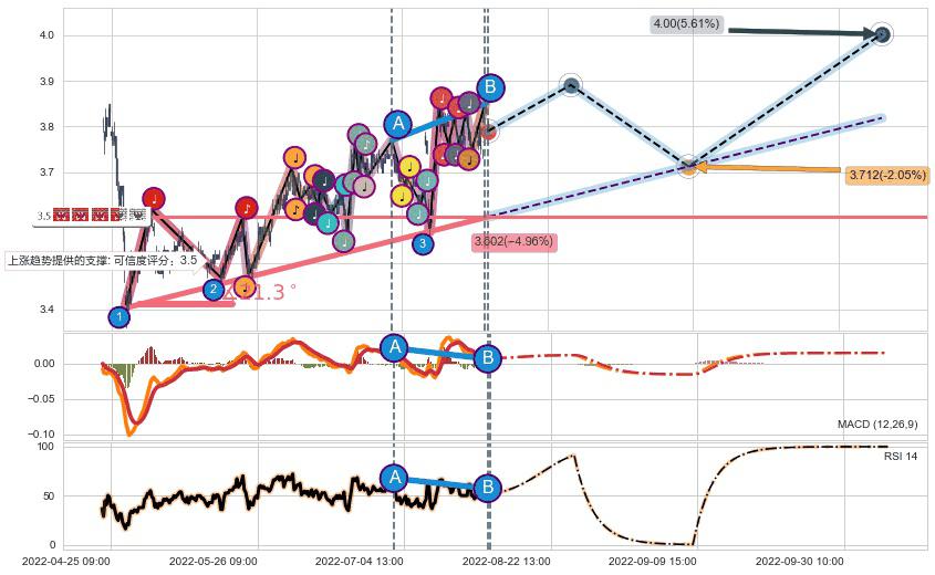 ♘ 阻力价格位3.900,可信任强度72.89%,距离最后交易2022-08-12 14:00形成的收盘价格3.790相差 +2.90%