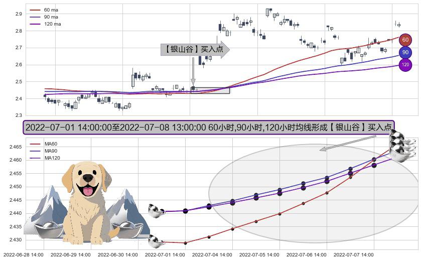 ⚀ 2022-07-04 13:00:00-小时至2022-07-08 13:00:00-小时显现 60小时-90小时-120小时均线 【银山谷】买入点 看多信号,后市看涨,买入