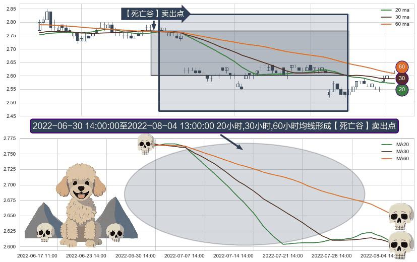 形态多维评估: ⚀ 2022-07-01 13:00:00-小时至2022-08-04 13:00:00-小时显现 20小时-30小时-60小时均线 【死亡谷】卖出点 看空信号,后市看跌,卖出