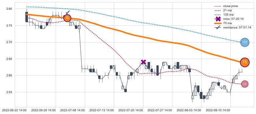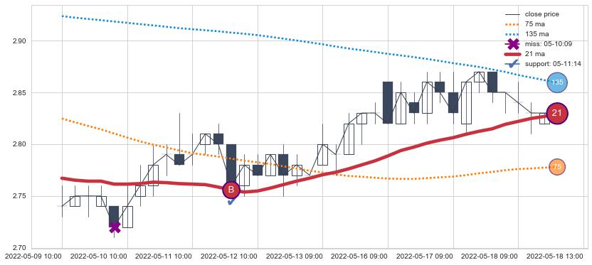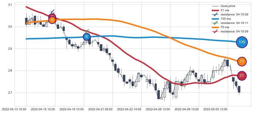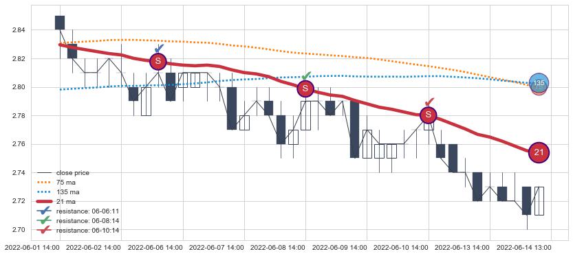下跌趋势04-13 10:00-05-06 11:00,均线75, 21, 135确认关键阻力2处