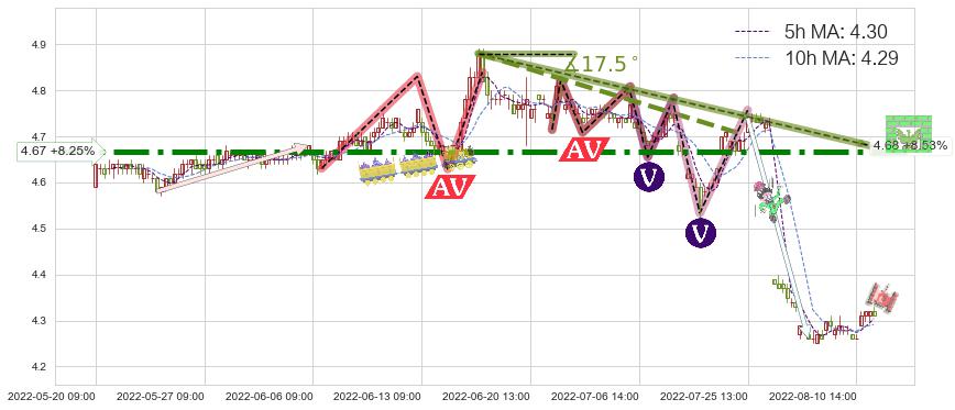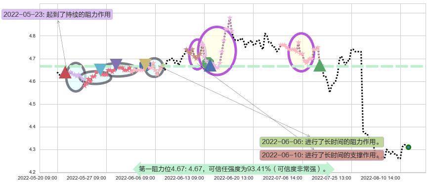 ♘ 阻力价格位4.67,可信任强度93.41%,距离最后交易2022-08-12 14:00形成的收盘价格4.31相差 +8.25%