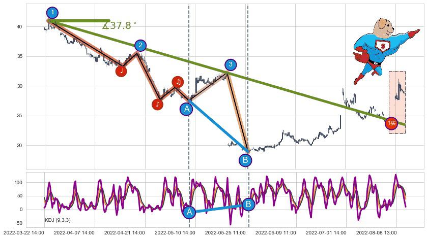 从2022-03-23 13:00至2022-06-06 13:00,共包含233个小时,阶段股价下跌-54.77%,阶段股价变动位移路程比: 1 : 4,下跌趋势角度: 37.8,2022-05-20 09:00向↘︎形成缺口,跳空下跌-38.03%˚