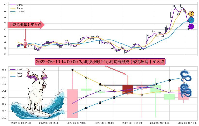 形态多维评估: ⚀ 2022-06-10 14:00:00小时显现 3小时-8小时-21小时均线 【蛟龙出海】买入点 看多信号,后市看涨,买入