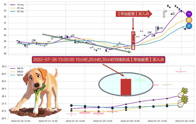 形态多维评估: ⚀ 2022-07-26 13:00:00小时显现 10小时-20小时-30小时均线 【旱地拔葱】买入点 看多信号,后市看涨,买入