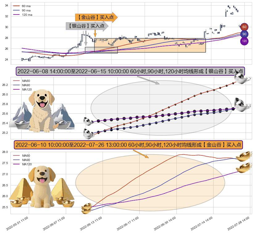 形态多维评估: ⚀ 2022-06-10 11:00:00-小时至2022-07-26 13:00:00-小时显现 60小时-90小时-120小时均线 【金山谷】买入点 其再次确认了买入信号,可靠性更强,买入