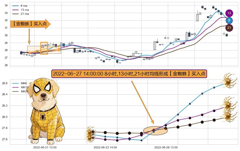 形态多维评估: ⚀ 2022-06-27 14:00:00小时显现 8小时-13小时-21小时均线 【金蜘蛛】买入点 看多信号,后市看涨,买入
