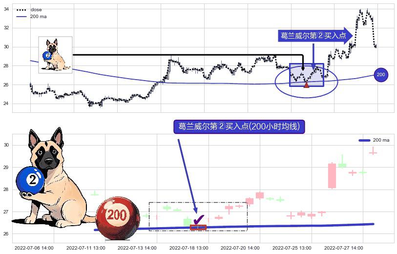形态多维评估: ⚀ 2022-07-15 14:00:00-小时显现 葛兰威尔均线 200小时均线 第②买入点 上升趋势的中继信号,后市看涨,买进信号