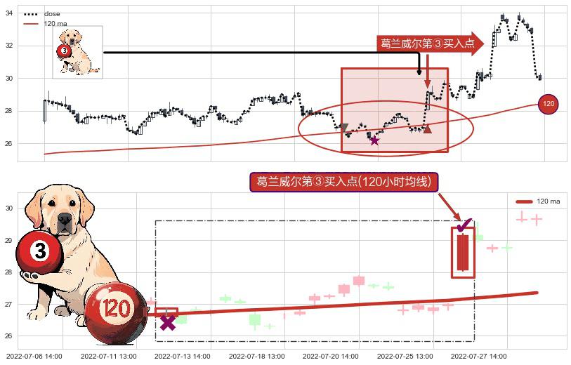 形态多维评估: ⚀ 2022-07-26 13:00:00-小时显现 葛兰威尔均线 120小时均线 第③买入点 上升趋势的中继信号,后市看涨,买进信号