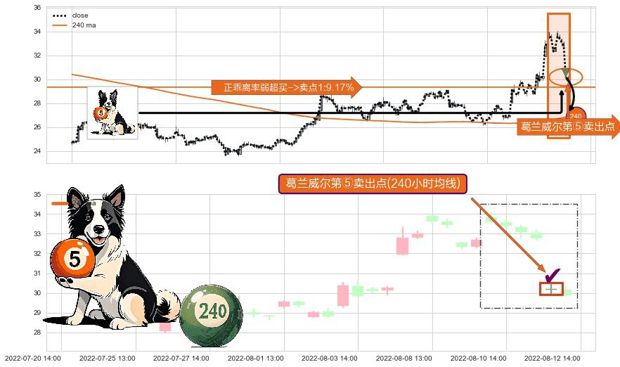 形态多维评估: ⚀ 2022-08-12 13:00:00-小时显现 葛兰威尔均线 240小时均线 第⑤卖出点 上升趋势均值回复的短线回落信号,后市看跌,卖出信号