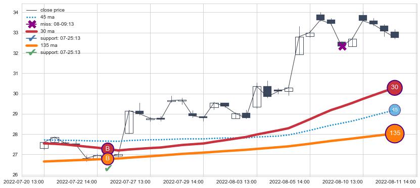 上涨趋势07-20 13:00-08-11 14:00,均线30, 135确认关键支撑1处
