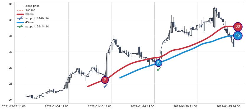 上涨趋势12-28 11:00-01-25 14:00,均线45, 30确认关键支撑2处