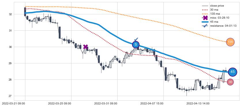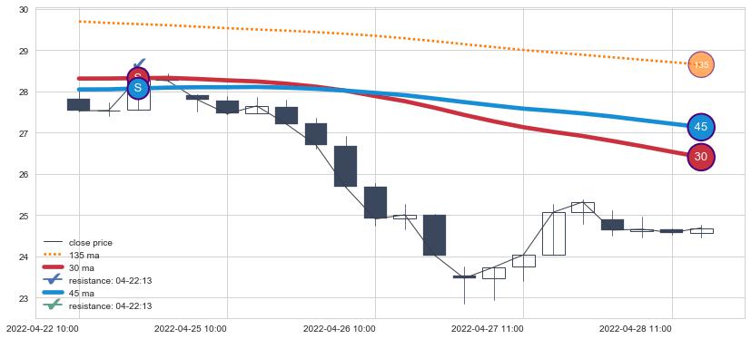 下跌趋势04-22 10:00-04-28 13:00,均线45, 30确认关键阻力1处