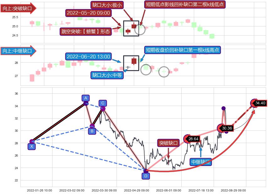 ➣ 突破缺口形成后,后续k已经超过14根,跳空突破【螃蟹】形态关键点后, 出现【轻微回踩】迹象,短期低点影线回补缺口第二根k线低点