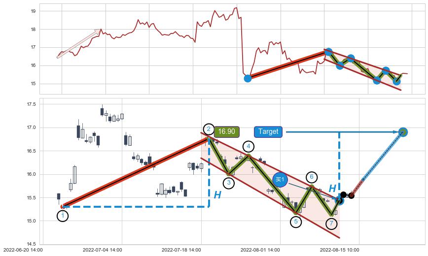 从2022-06-23 13:00至2022-06-30 14:00,共包含12个小时,阶段股价上涨12.52%,阶段股价变动位移路程比: 1 : 1.5