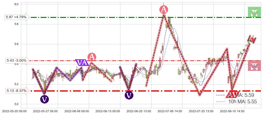 ♘ 阻力价格位5.87,可信任强度55.18%,距离最后交易2022-08-12 14:00形成的收盘价格5.60相差 +4.79%
