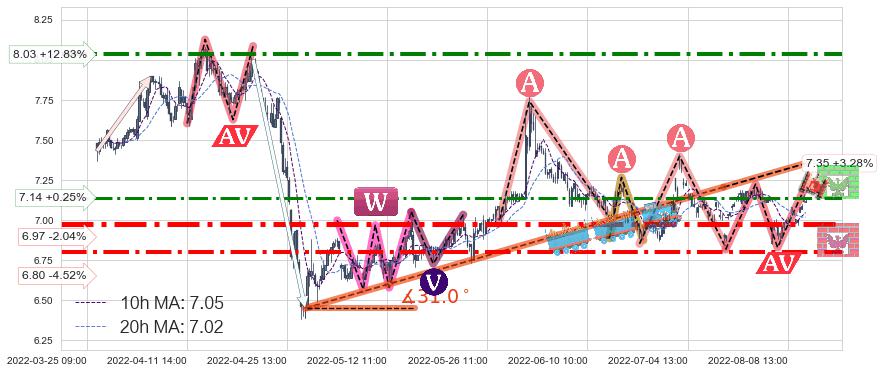 ♘ 阻力价格位7.14,可信任强度66.36%,距离最后交易2022-08-12 14:00形成的收盘价格7.12相差 +0.25%