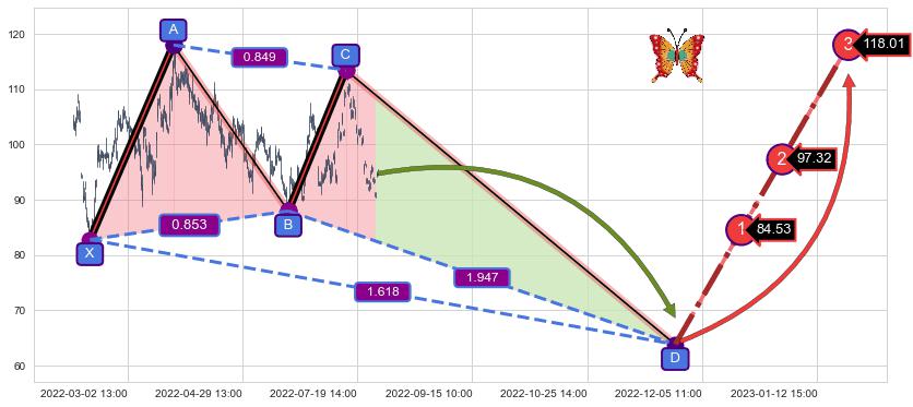 ➣ 未完成【蝴蝶】形态起点X: 02-11:13, 已到达C点: 07-05:14, 预测最终D点: 11-24:13, 共1014交易小时
