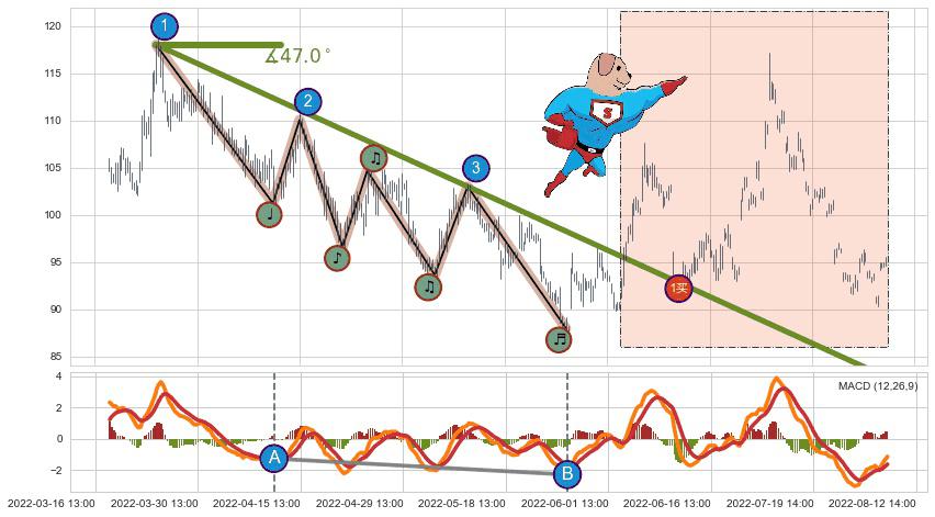 从2022-03-24 13:00至2022-06-08 09:00,共包含238个小时,阶段股价下跌-9.72%,阶段股价变动位移路程比: 1 : 24,下跌趋势角度: 47.0