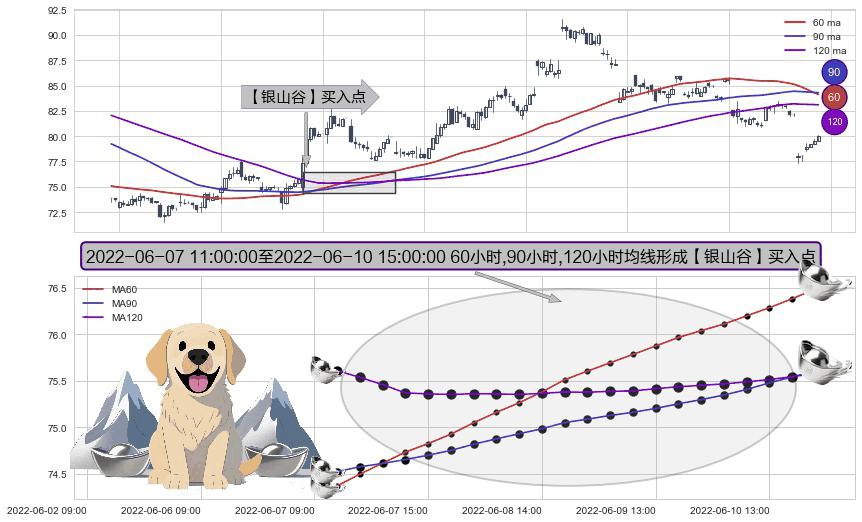 ⚀ 2022-06-07 13:00:00-小时至2022-06-10 15:00:00-小时显现 60小时-90小时-120小时均线 【银山谷】买入点 看多信号,后市看涨,买入