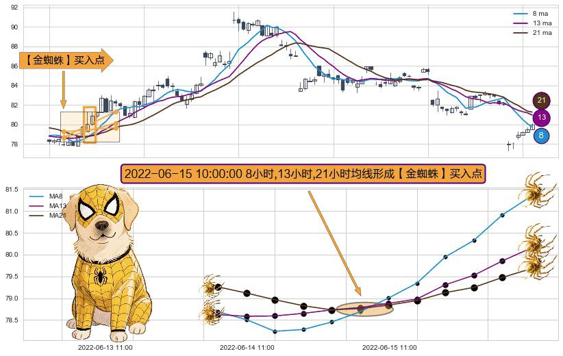 ⚀ 2022-06-15 10:00:00小时显现 8小时-13小时-21小时均线 【金蜘蛛】买入点 看多信号,后市看涨,买入