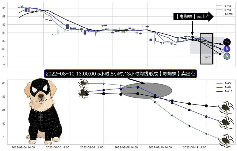 ⚀ 2022-08-10 13:00:00小时显现 5小时-8小时-13小时均线 【毒蜘蛛】卖出点 看空信号,后市看跌,卖出