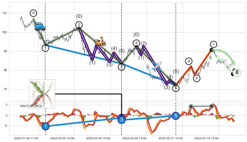 ➣ a,c调整浪MACD, RSI, KDJ走势都【未出现】背离,abc走势延续, 5浪反转概率增强