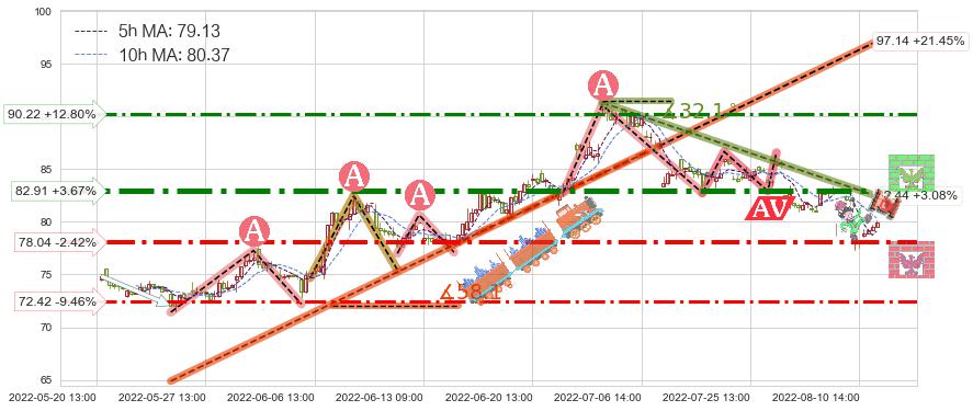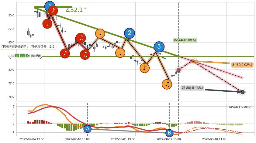 ➢ 预测:2022-08-15 14:00,【小幅反弹】稳定目前下跌趋势的前提下,预测价格:81.60