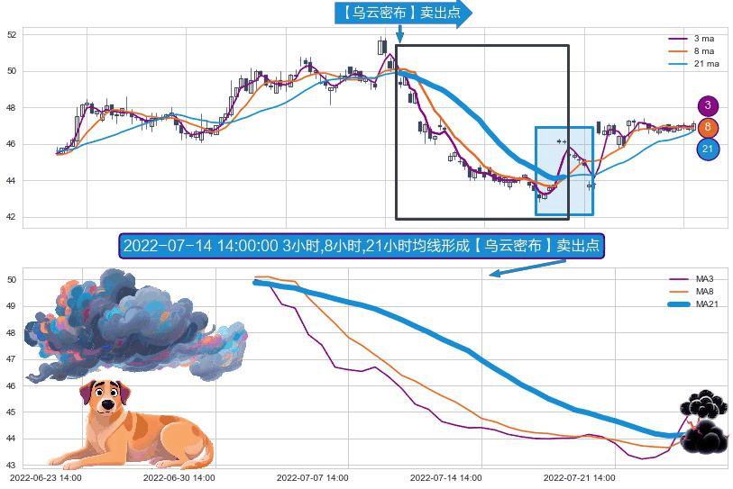 ⚀ 2022-07-04 13:00:00小时-2022-07-26 14:00:00小时显现 3小时-8小时-21小时均线 【乌云密布】卖出点 看空信号,后市看跌,卖出