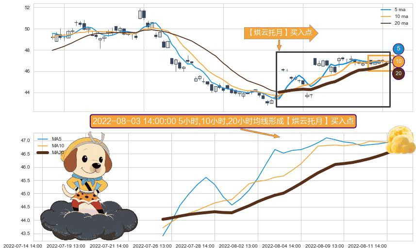 ⚀ 2022-07-25 14:00:00小时-2022-08-12 13:00:00小时显现 5小时-10小时-20小时均线 【烘云托月】买入点 看多信号,后市看涨,买入