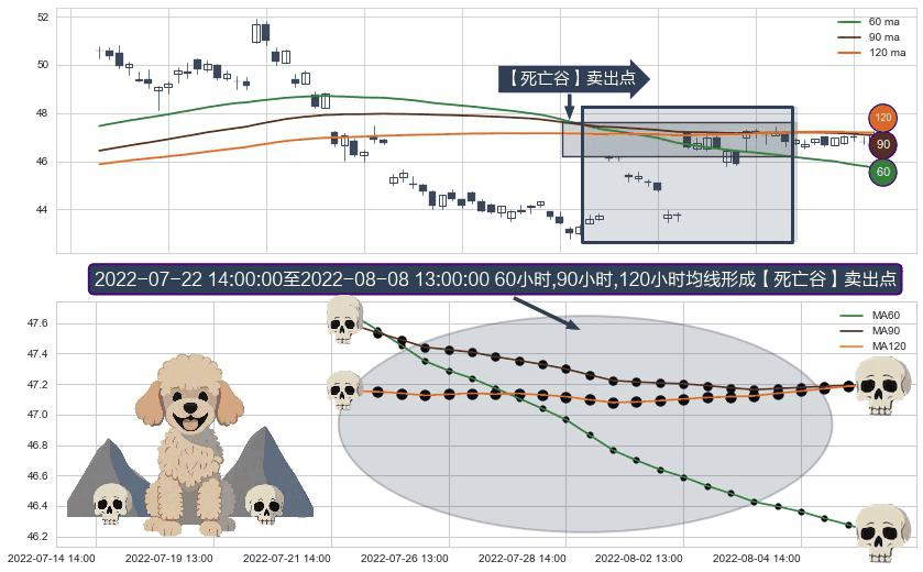 ⚀ 2022-07-25 13:00:00-小时至2022-08-08 13:00:00-小时显现 60小时-90小时-120小时均线 【死亡谷】卖出点 看空信号,后市看跌,卖出