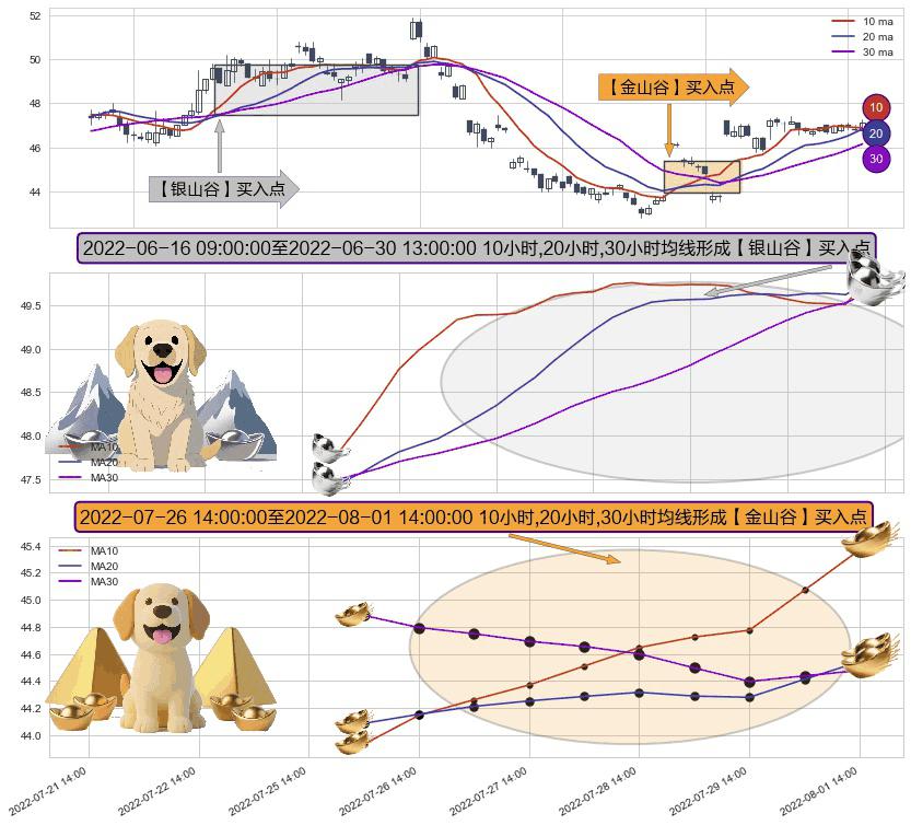 ⚃ 2022-07-27 13:00:00-小时至2022-08-01 14:00:00-小时显现 10小时-20小时-30小时均线 【金山谷】买入点 其再次确认了买入信号,可靠性更强,买入