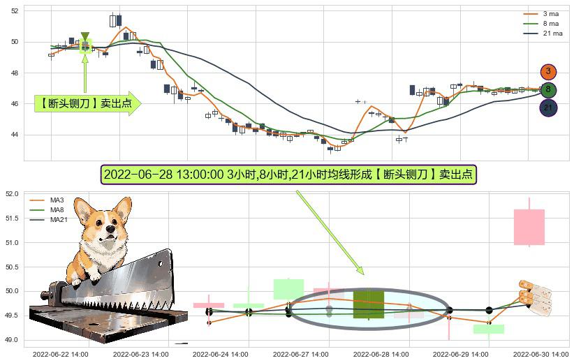 ⚀ 2022-06-28 13:00:00小时显现 3小时-8小时-21小时均线 【断头铡刀】卖出点 看空信号,后市看跌,卖出