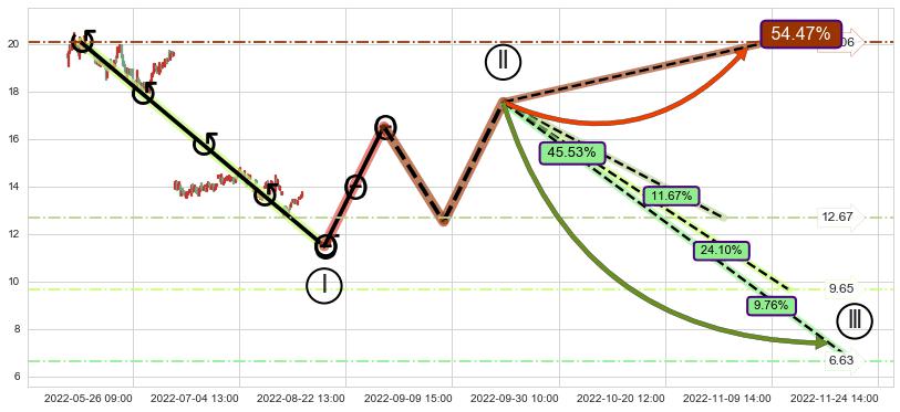 ➣ 循环浪继续向下【平均值】位置(11-14:09, 9.65),匹配聚类样本比例52.93%, 可能性概率24.10%