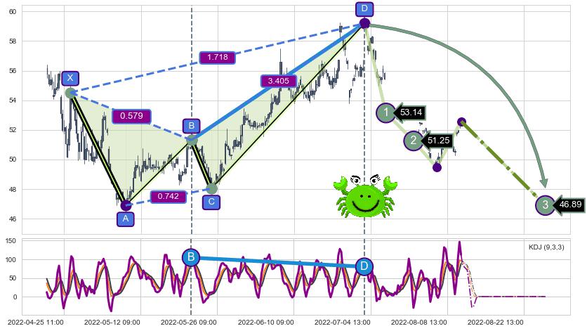 ➢ 谐波价格D点比B点高 ⤴,【KDJ】指标D点比B点低 ⤵️