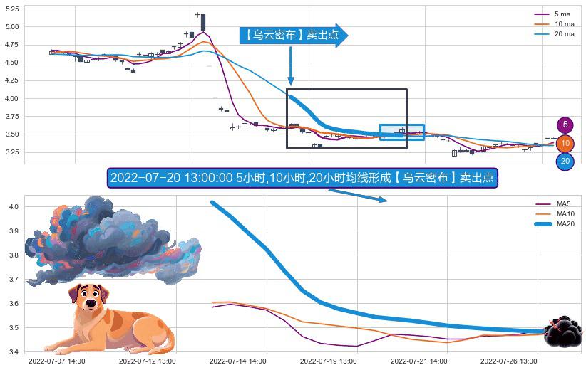 形态多维评估: ⚀ 2022-07-13 13:00:00小时-2022-07-26 14:00:00小时显现 5小时-10小时-20小时均线 【乌云密布】卖出点 看空信号,后市看跌,卖出