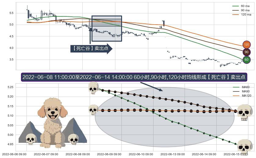 形态多维评估: ⚀ 2022-06-08 13:00:00-小时至2022-06-14 14:00:00-小时显现 60小时-90小时-120小时均线 【死亡谷】卖出点 看空信号,后市看跌,卖出