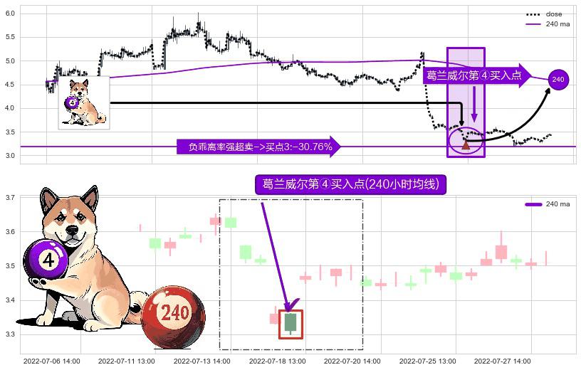 形态多维评估: ⚀ 2022-07-15 14:00:00-小时显现 葛兰威尔均线 240小时均线 第④买入点 下降趋势均值回复的短线反弹信号,后市看涨,买进信号