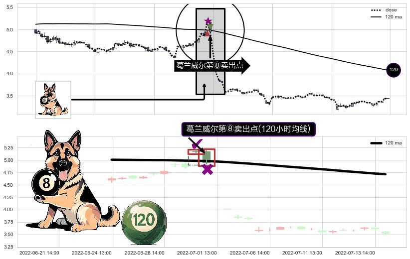 形态多维评估: ⚀ 2022-06-30 14:00:00-小时显现 葛兰威尔均线 120小时均线 第⑧卖出点 下降趋势的中继信号,后市看跌,卖出信号