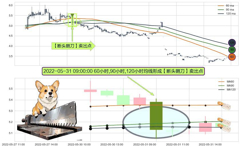 形态多维评估: ⚀ 2022-05-31 09:00:00小时显现 60小时-90小时-120小时均线 【断头铡刀】卖出点 看空信号,后市看跌,卖出