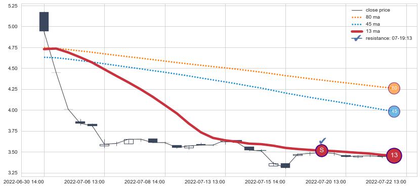 下跌趋势06-30 14:00-07-22 13:00,均线13确认关键阻力1处
