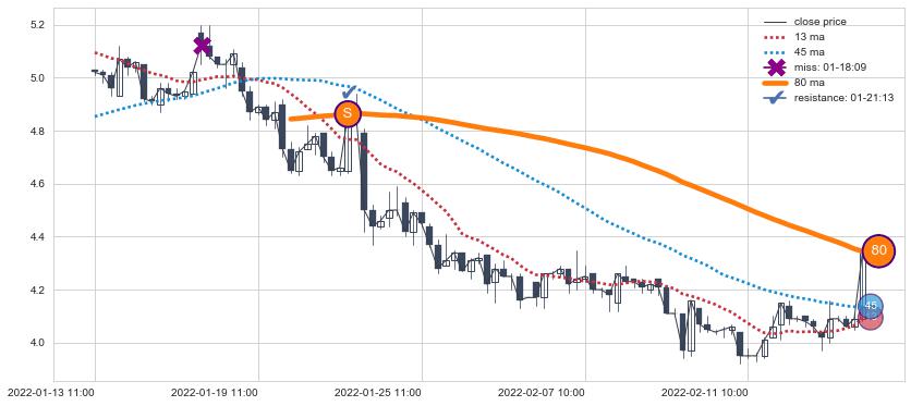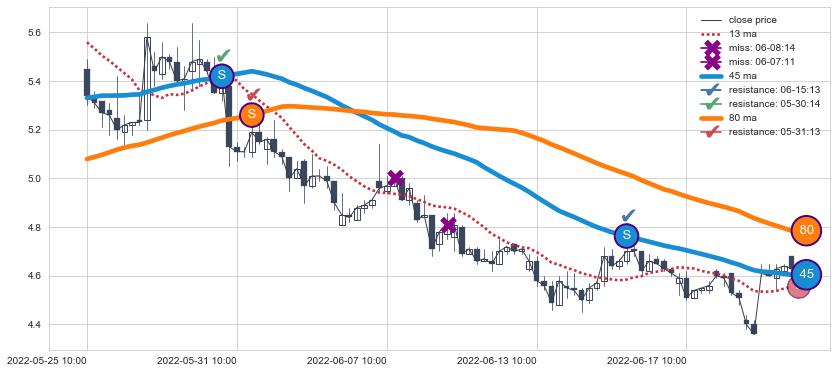 下跌趋势05-25 10:00-06-27 13:00,均线80, 45确认关键阻力3处