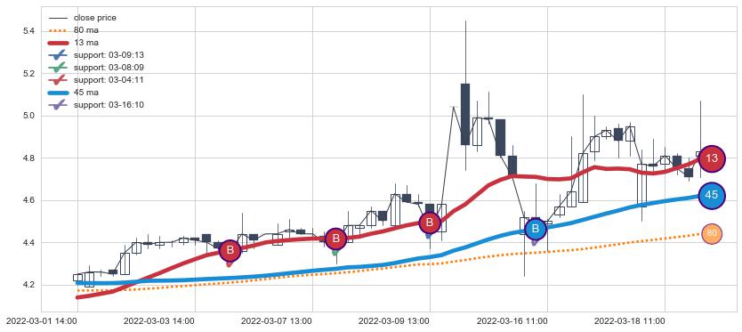 上涨趋势03-01 14:00-03-21 09:00,均线45, 13确认关键支撑4处